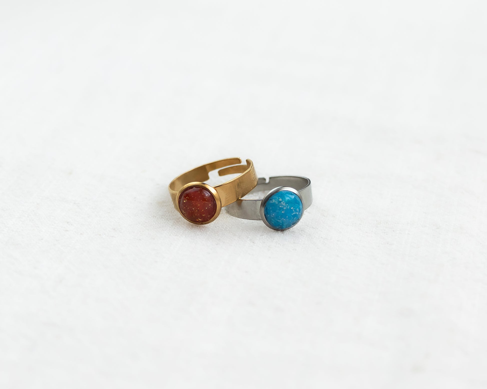 Cabuchón en arcilla polimérica con destellos — rojo terracota con montura dorada, o azul turquesa con montura plateada — en una base ajustable que le queda a cualquier dedo. Chico en tamaño, con harta personalidad igual.