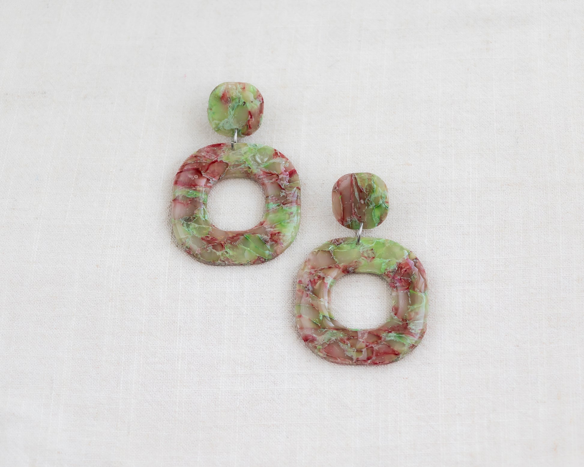 Stud cuadradito del que cuelga un aro circular con agujero al centro, todo en arcilla polimérica veteada en verde lima, rojo y blanco nacarado. Una paleta que parece sacada directo de la naturaleza pero con harta personalidad igual.